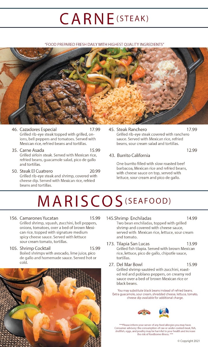 Grilled rib-eye steak and shrimp, covered with melted cheese served with mexican rice, refried beans and tortillas.