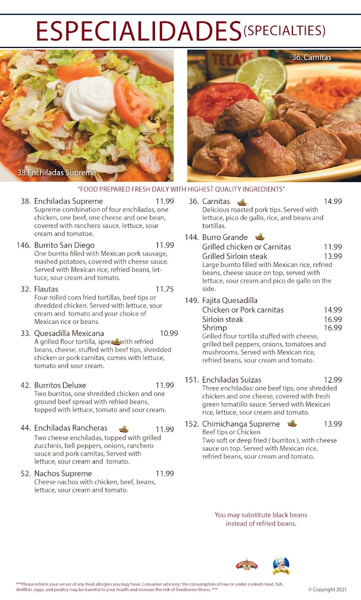 Burrito filled with mexican pork sausage and mexican mashed potatoes covered with cheese sauce served with mexican rice, refried beans, lettuce, tomato and sour cream.